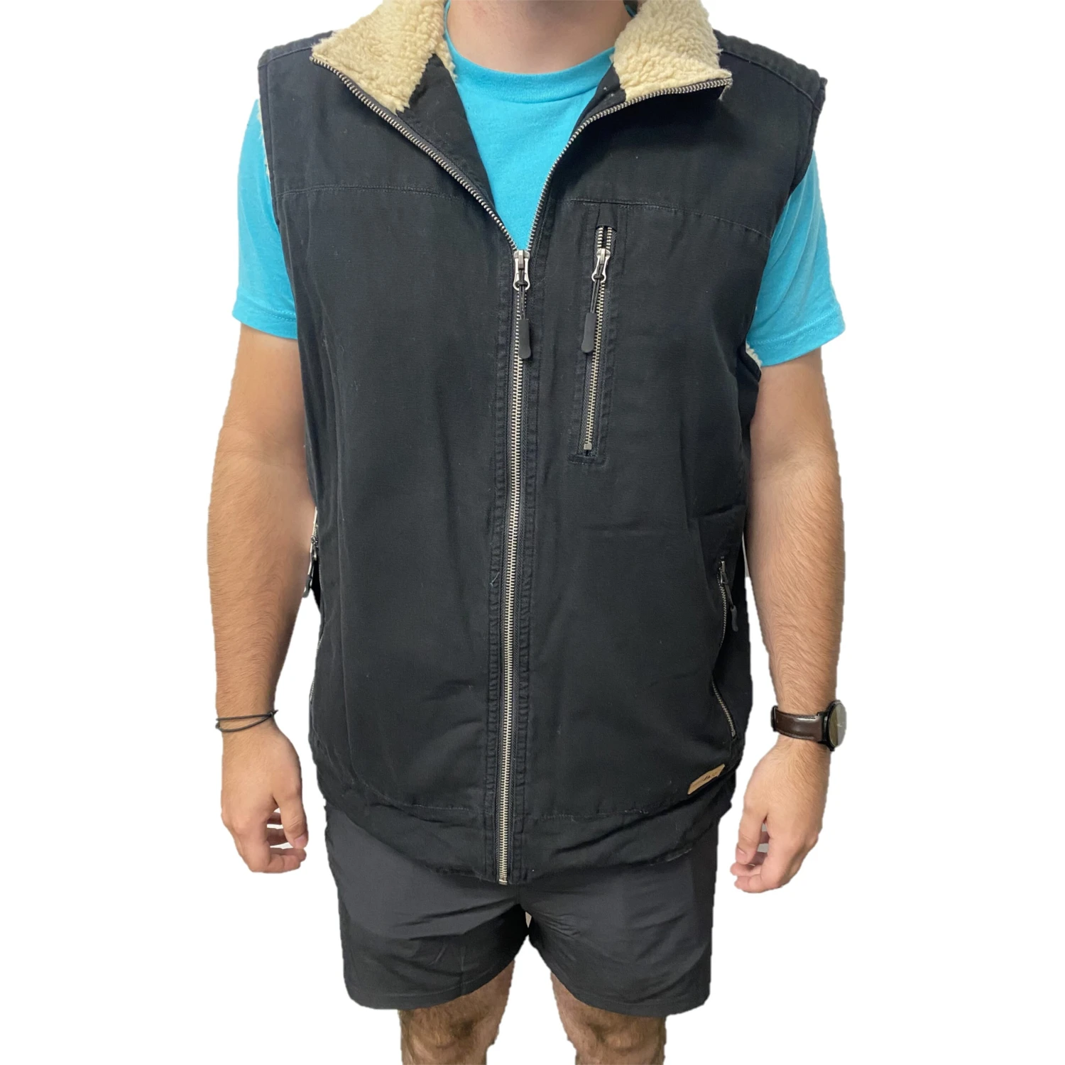- Solid black cotton canvas vest.